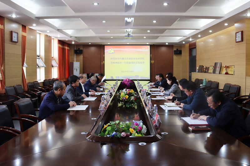 2021年4月14日上午,內(nèi)蒙古交通職業(yè)技術學院院長范體貴、副院長鄭廣軍帶領黨政辦公室、教務處、招生工作處、教學培訓實習部等部門負責人來我院考察交流。學院黨委書記孫智憑會見了范體貴院長一行。學院黨委副書記、院長白托婭,副院長孫恒及相關職能部門負責人與范體貴院長一行在A439會議室進行了座談交流。