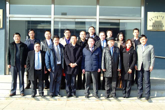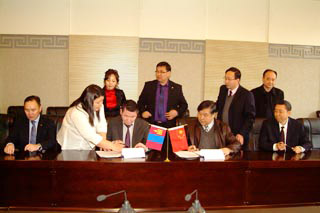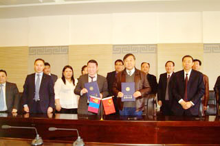 | 蒙古國執(zhí)行機構汽車運輸局副局長納?普恩查格(前排左三) 學校副校長齊木德道爾吉(前排右二)學院院長柴金義(前排右一)簽署協(xié)議 | 合影 |