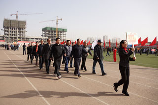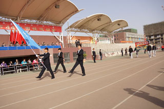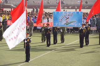 上午8時,伴隨著運動員進(jìn)行曲明快激揚的節(jié)奏,儀仗隊、裁判員代表隊、各班級運動員、教師方隊依次入場。