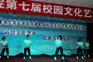 晚會文藝表演共分為三個篇章,第一篇章“交融文化、揮灑熱情”——陜北民歌《想親親》、舞蹈《春到草原》、小品《公交車上》、魔術(shù)《第六感》、歌曲《不要怕》等各具特色的表演來交融文化,揮灑熱情;第二篇章“朝氣蓬勃、彰顯青春”——蒙語歌曲《兩座山》、朗誦《青春飛揚(yáng)》、吉他彈唱《外面的世界》、特色舞蹈《阿拉伯之夜》來展現(xiàn)朝氣蓬勃的我們,彰顯我們的青春;第三篇章“和諧校園、藝術(shù)共舞”——歌曲《大地飛歌》、雙簧表演《大雙簧》、歌曲《只要有你》、酷炫舞蹈《Runaway baby》來表達(dá)我們對和諧校園藝術(shù)共舞的愿望。眾多的優(yōu)秀節(jié)目既展現(xiàn)了同學(xué)們的青春個性魅力,也更加凸顯了第七屆校園文化藝術(shù)節(jié)的豐厚文化底蘊(yùn)。這是一場青春澎湃、激情四射的藝術(shù)盛宴。