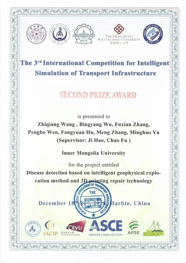 2024年12月18日至21日,由哈爾濱工業(yè)大學(xué)承辦的第三屆國際交通基礎(chǔ)設(shè)施智能仿真大賽決賽在哈爾濱舉行。由我院土木工程系(籌)王志強(qiáng)老師帶隊(duì),郝吉、付超老師共同指導(dǎo),張芾翔(土木工程2302班)、溫蓬勃(道路橋梁與渡河工程2302班)、胡方圓(土木工程2302班)、張萌(土木工程2302班)、于洺浩(土木工程2302班)等人組成的“Northern-Goshawk”隊(duì)提交的參賽作品“Disease detection based on intelligent geophysical exploration method and 3D printing repair technology”(智能物探的隱蔽災(zāi)害探測(cè)與3D打印技術(shù))獲得本次大賽二等獎(jiǎng)(唯一全部參賽學(xué)生均為低年級(jí)本科生)。
