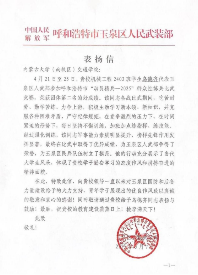 烏德齊,男,2002年11月生人,內(nèi)蒙古鄂爾多斯鄂托克前旗人,2021年9月考入內(nèi)蒙古大學交通學院機械工程專業(yè)學習,2023年3月參軍入伍,入伍期間榮獲2024年度“四有”優(yōu)秀士兵嘉獎,2025年3月退伍復學。